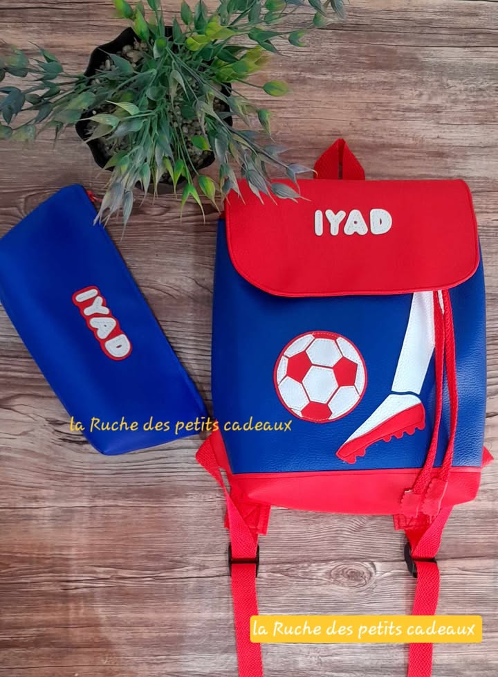 Modèle bleu et rouge avec motif football, idéal pour l’école, les sorties ou le sport.