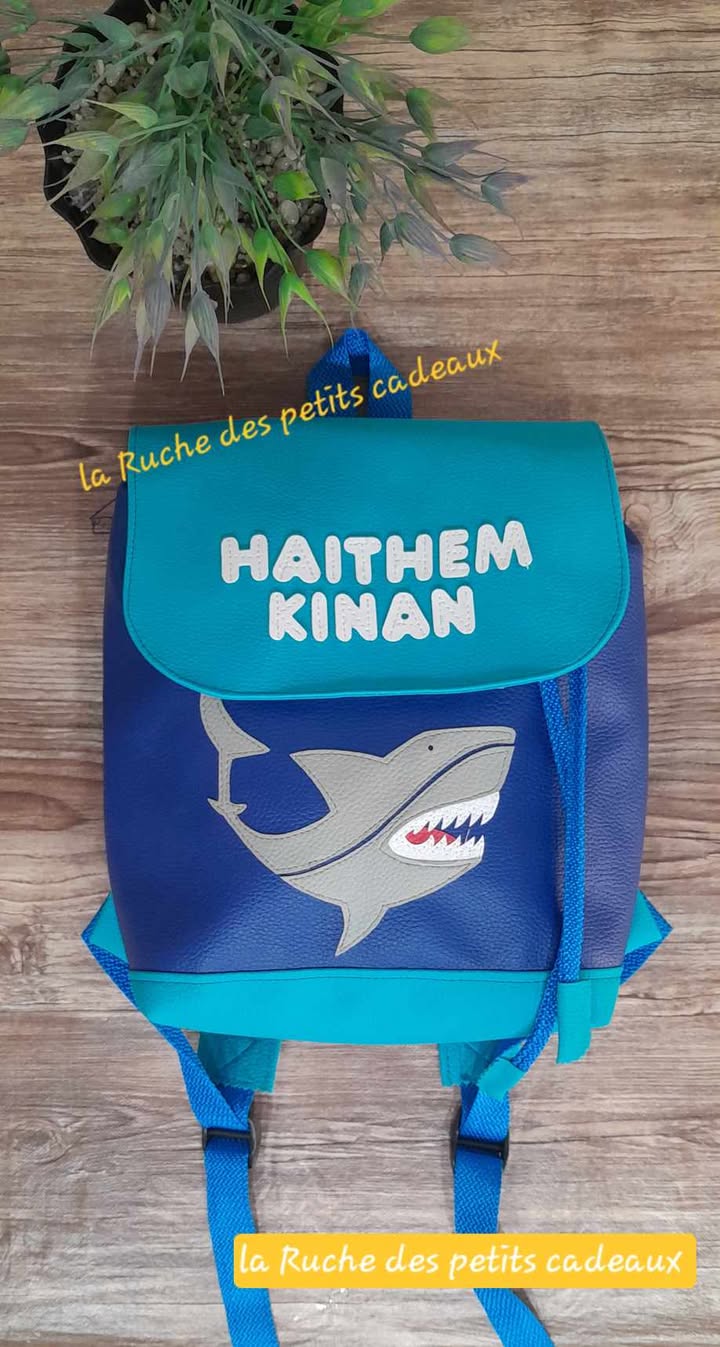 Modèle aux couleurs bleu roi et turquoise au motif requin de couleur grise , idéal pour l’école, les sorties ou les activités extrascolaires.